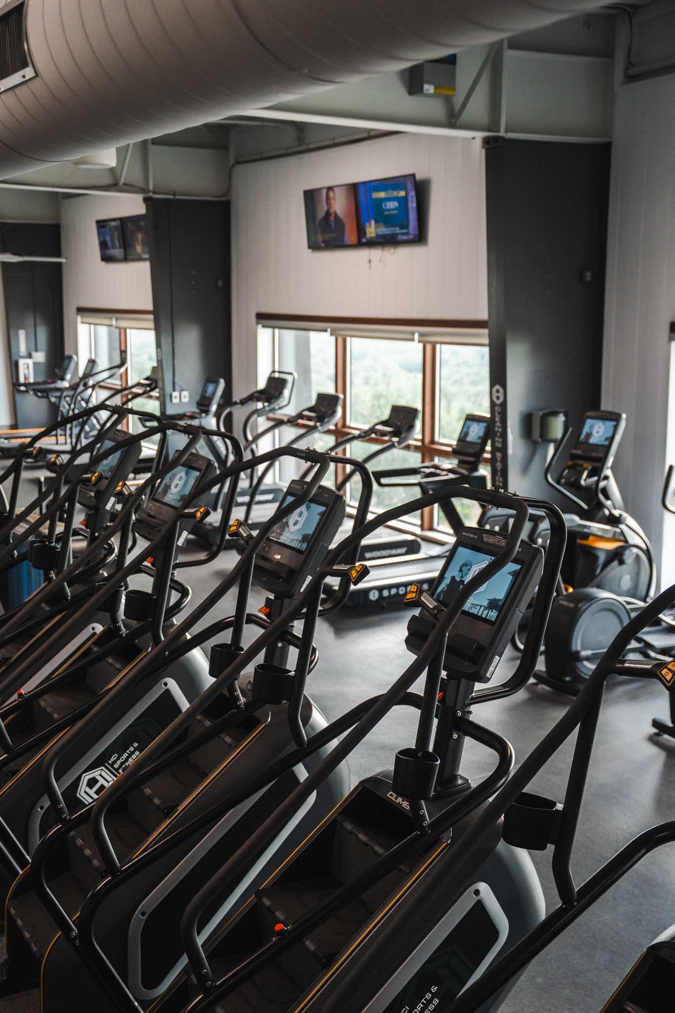 Elevated cardio deck featuring multiple treadmills, bikes, and machines with views of the courts and track.