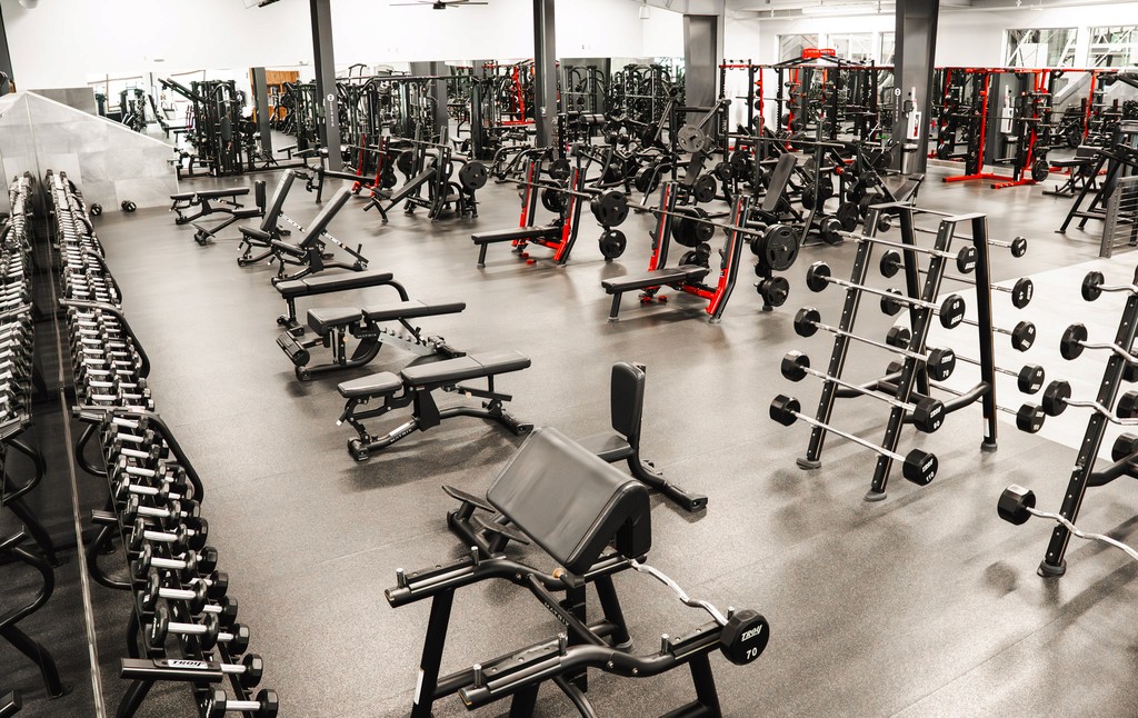 A dedicated weight floor featuring machines, plate-loaded equipment, and free weights for strength training.